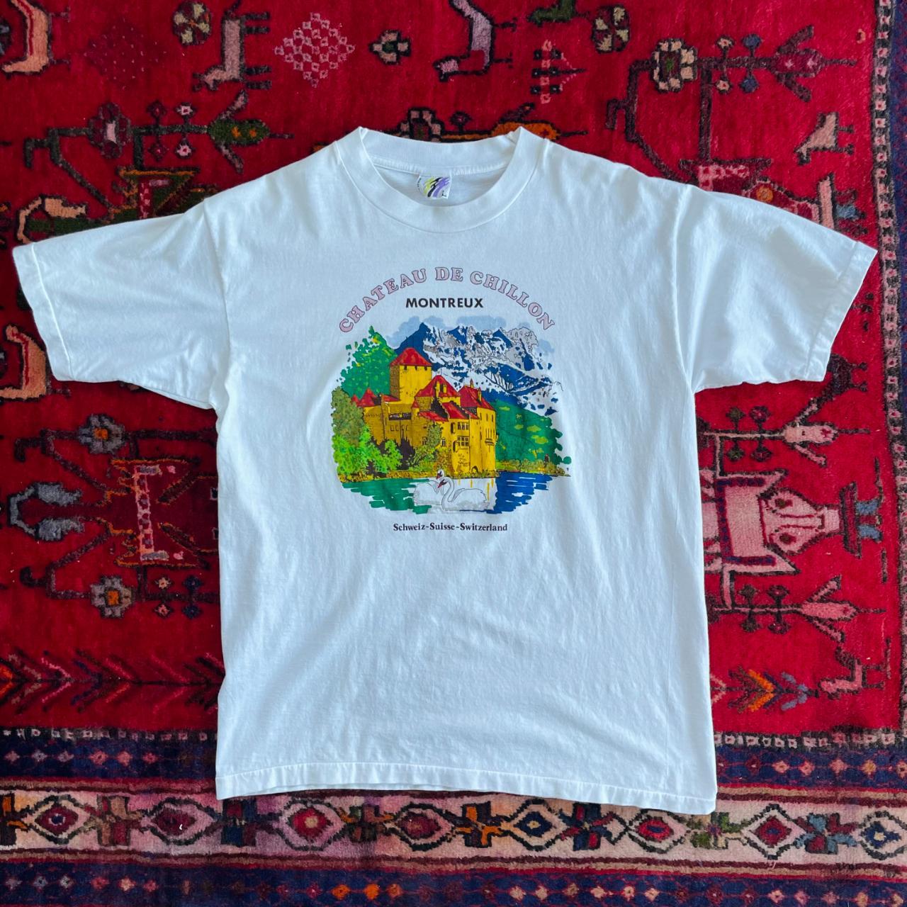 Grüezi! 1990s 100% cotton lightweight tee with a colorful illustration of the medieval Swiss island castle Chillon on Lake Geneva, featuring some lovely swans. Excellent condition. Tag says L, fits like a modern Medium. 19” width – $30.00
